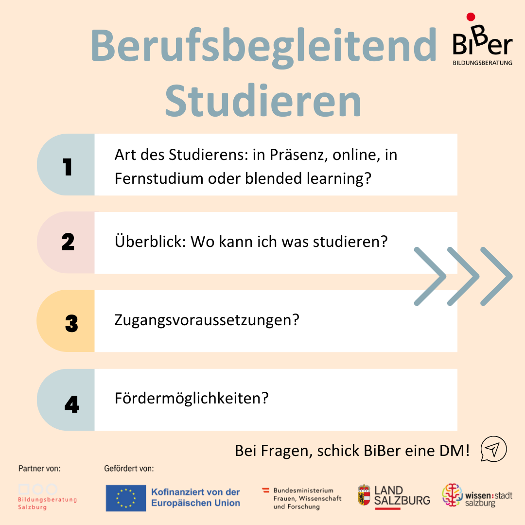 Arbeiten und gleichzeitig ein Studium oder eine Weiterbildung machen? Das ist viel auf einmal, aber dennoch bei guter Planung und Organisation, mit hoher Selbstmotivation und viel Durchhaltevermögen möglich. 👍🙂 Mehr Info und Beratung zu verschiedenen Formen und Förderungen in persönlichen Beratungsgesprächen: