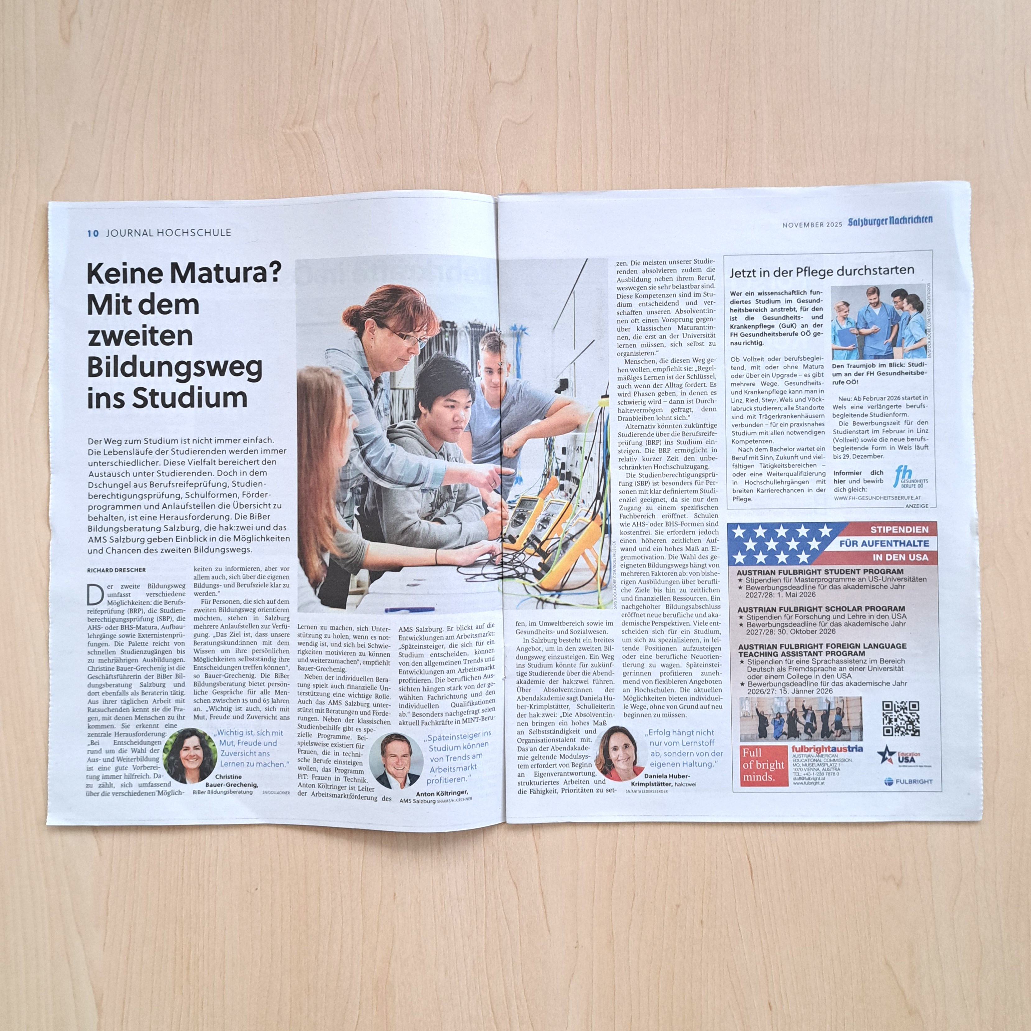 In diesem Beitrag werden die verschiedenen Möglichkeiten und Chancen gezeigt, wie ein Hochschulzugang im zweiten Bildungsweg erreicht werden kann (Journal Hochschule, Salzburger Nachrichten, 07.11.2025)