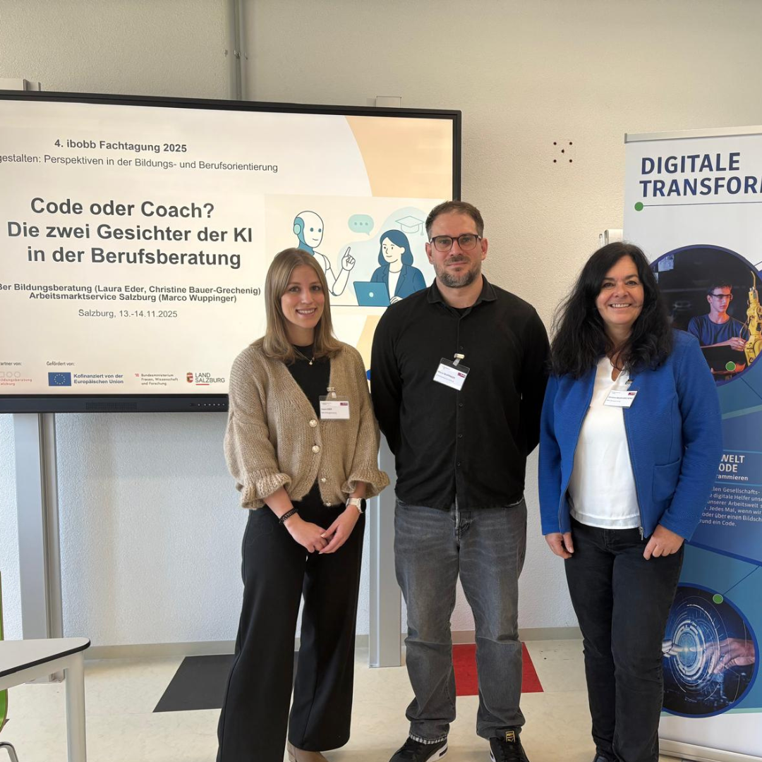 Im Rahmen der 4. ibobb Fachtagung an der PH Salzburg zum Thema: "Zukunft gestalten: Perspektiven in der Bildungs- und Berufsberatung" durften wir uns gemeinsam, AMS Salzburg (Marco Wuppinger) und BiBer Bildungsberatung (Christine Bauer-Grechenig und Laura Eder) genau diesem Thema widmen.